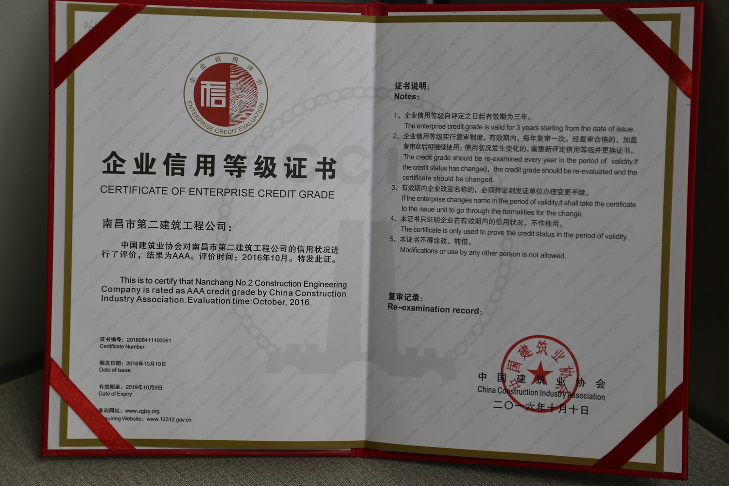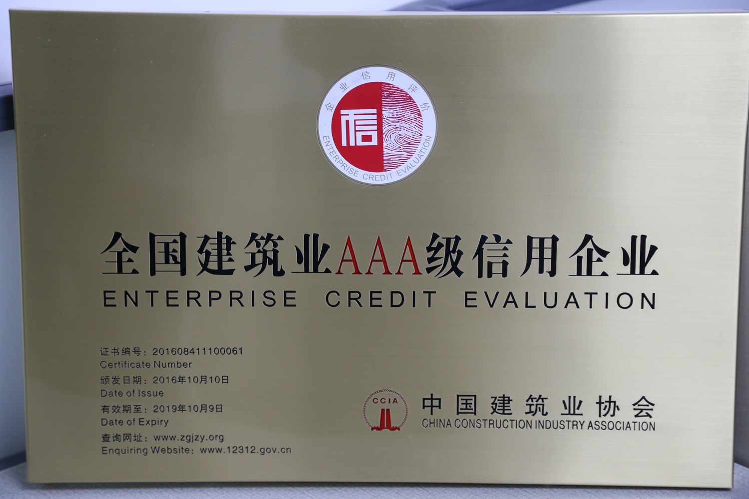 企業(yè)信用等級(jí)是由中國(guó)建筑業(yè)協(xié)會(huì)經(jīng)審核、篩選和評(píng)定而確定的,有效期3年,每年復(fù)審一次。由于公司一直本著誠(chéng)信、服務(wù)、質(zhì)量為上的原則,獲得了中國(guó)建筑業(yè)協(xié)會(huì)及社會(huì)大眾的認(rèn)可,2016年10月公司再度榮獲“AAA級(jí)信用企業(yè)”的榮譽(yù)稱號(hào)。這個(gè)全國(guó)建筑行業(yè)都為數(shù)不多的榮譽(yù)是對(duì)我們企業(yè)的肯定及嘉獎(jiǎng),讓我們樹(shù)起信譽(yù)旗幟,再創(chuàng)輝煌,攜手走得更好、更遠(yuǎn)。